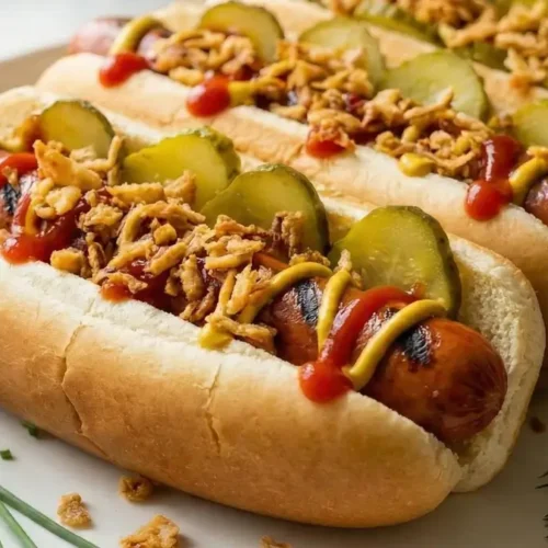 Nimm die Würstchen aus dem Airfryer und lege sie in die warmen Brötchen. Jetzt kommt der beste Teil: Serviere die Hot Dogs mit Ketchup, Senf und den Gurkenscheiben. Zum Schluss streust du die Röstzwiebeln darüber. die sorgen für den perfekten Crunch.